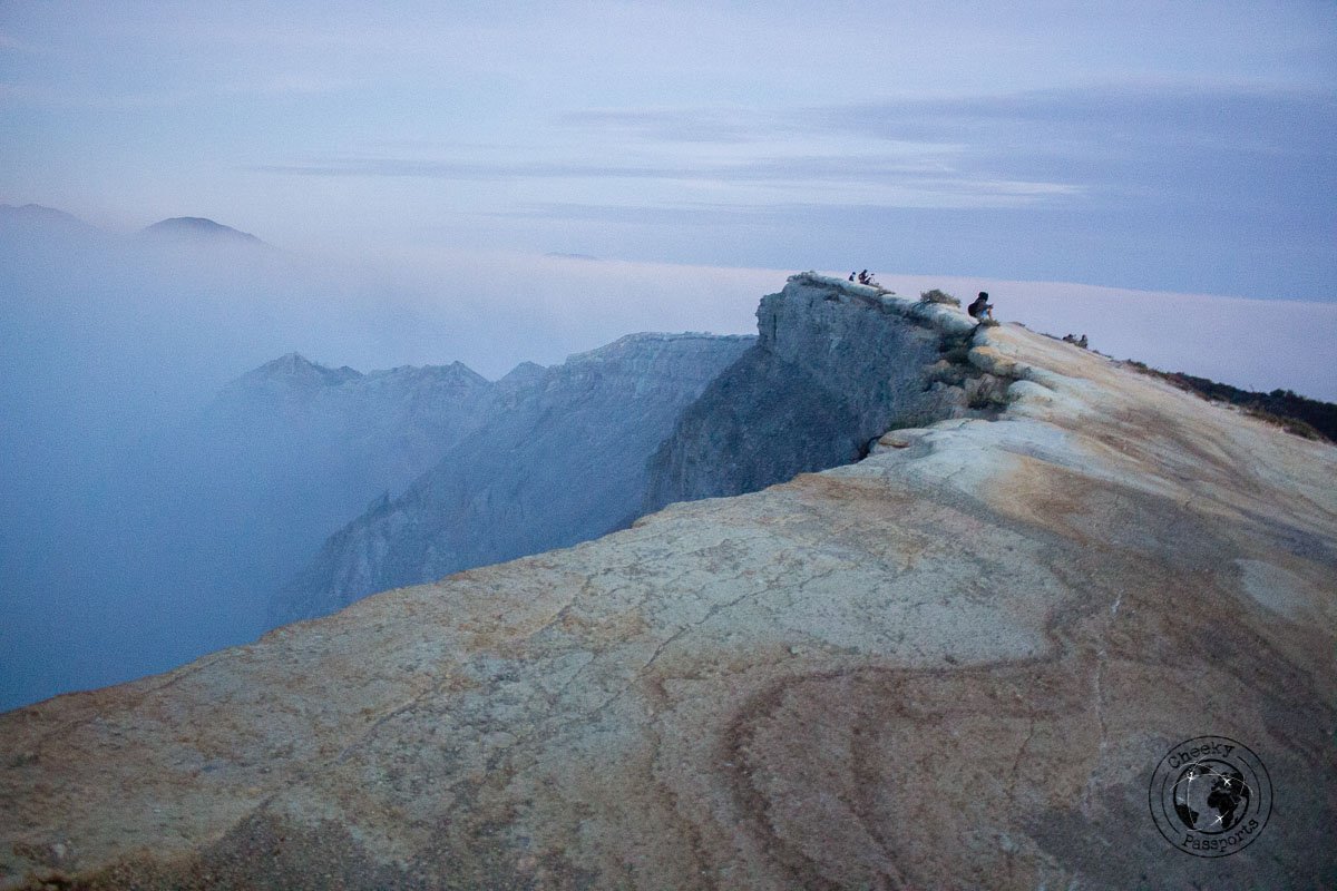 After having hiked up and the down to the crater to view the Kawah Ijen blue flames, you can make your way to a path on the left going around the rim of the crater to an area where people gather round in groups to wait for sunrise.